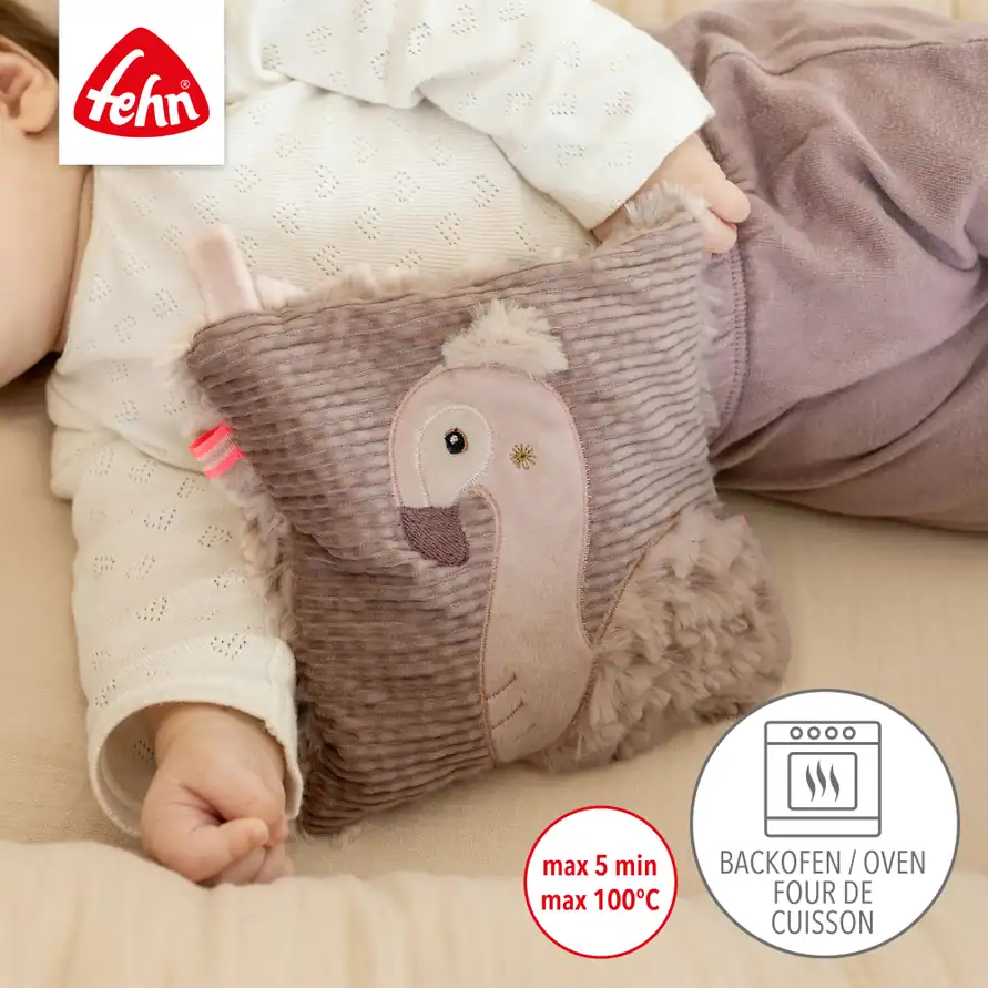 Kersenpitkussen Flamingo – een warmtekussen voor baby’s dat troost en ontspanning biedt.