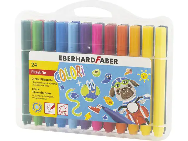 Dikke Jumbo viltstiften met ergonomische driehoekige vorm in 24 schitterende kleuren met geventileerde dop. Lijnbreedte 2 mm. Perfect voor vlakke kleuringen. Inkt op waterbasis en trekt niet door het papier. Daarom bijzonder geschikt voor kleurboeken en kleurblokken. Uitwasbaar uit de meeste textielsoorten. Etui in koffervorm en daarom ideaal om cadeau te geven of om mee te nemen op vakantiereizen. Inhoud 24 dikke viltstiften in kunststof etui.